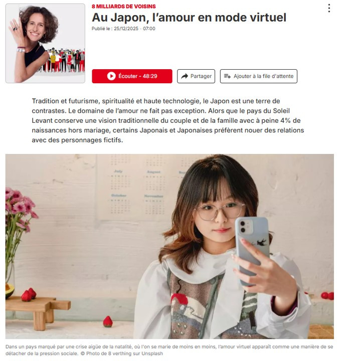 L’émission 8 milliards de voisins de RFI a consacré un épisode à ces évolutions, en s’intéressant aux relations affectives virtuelles au Japon.
