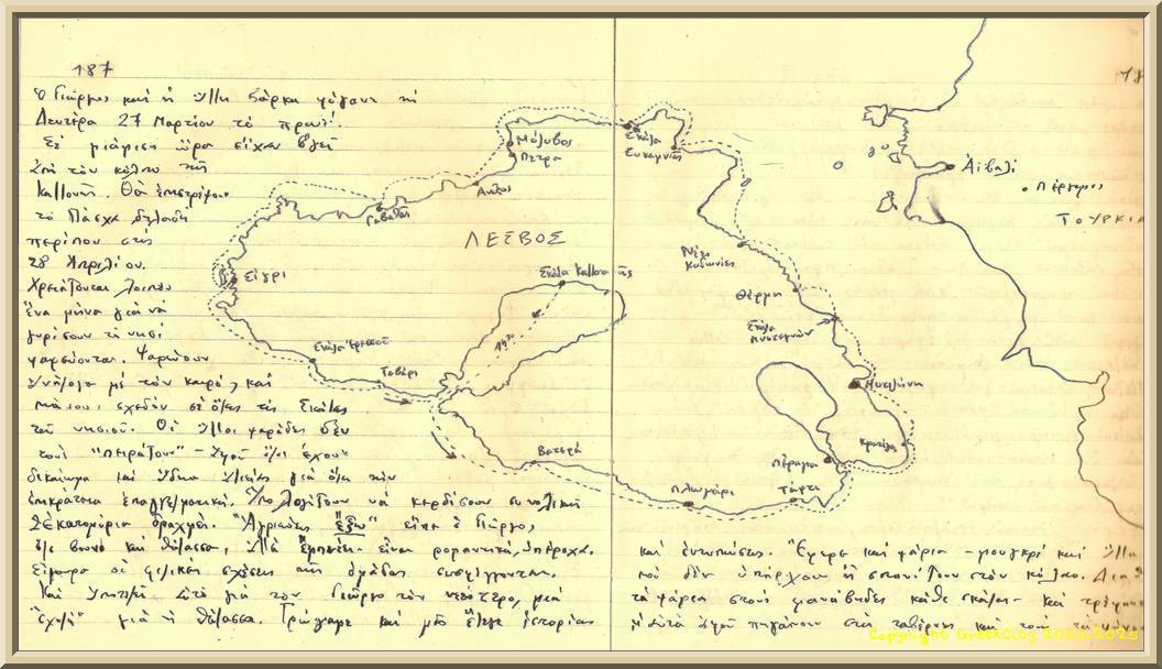 Sous ces bons auspices, ma décision d’entreprendre un terrain d’ethnologie en observation dite “participante” à Lesbos n’était donc pas née du hasard, loin de là. Et la suite de cette histoire, fut tout autant prévisible. Je n’ai d’ailleurs plus jamais renouvelé mon expérience de terrain ethnographique à Lesbos, pour une raison bien simple. J’ai poursuivi mes études en Histoire et ma thèse d’historien, soutenue seulement quelques années plus tard à l’Université d’Amiens, fut intitulée : “Vie et représentations du soldat grec pendant la guerre gréco-turque en Asie-Mineure, 1919-1922”. L’île de Lesbos et sa mémoire vivante étant sans doute passées par là !Raison de plus pour considérer ce carnet sous le regard de l’historien, car à sa lecture on mesure suffisamment toute la distance qui nous sépare de Lesbos, voire de la Grèce et même de l’Europe de ces années-là, lesquelles disons-le, étaient moins apocalyptiques que notre temps présent.