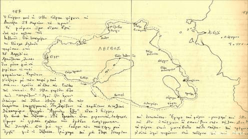 Notes et carte de Lesbos depuis mon carnet de notes, 1989